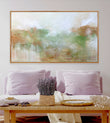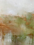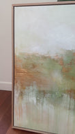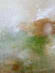 Delicate tones of olive green, cream and white feature in this calming piece. With organic shapes reminiscent of continents, and drip details which reveal layers beneath. Such a stunning piece with textured surface and metallic accents.