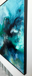 Inspired by the ocean and the feeling of weightlessness and peace when waves wash over you. Rich blues, deep greens and pops of white feature in this mixed media work.