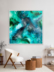 Measuring 100 x 100cm x 3.5cm, this artwork has edges painted in teal/turquoise and is ready to hang. Or choose a black, white or raw oak frame (allow 1-2 weeks for reframing). See mock up pictures for ideas on how the piece looks framed. Framed dimensions 103 x 103 x 4.5cm.