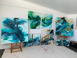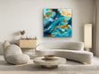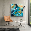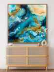 Ocean inspired green and blue flow painting. Large square with raw oak frame