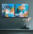Beautiful abstract piece with pastel pink, teal and warm ochre tones. Featuring a range of mediums including acrylic paint, inks and high flow – so much detail to discover.