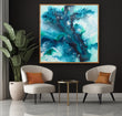 Created with multiple fluid and textured layers, this piece is full of movement and intricate details. Rich navy blues contrast with deep green, turquoise and highlights of white spray paint which resemble flowers or underwater creatures drifting through.