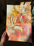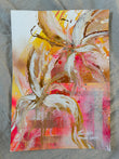 Small abstract flower original painting in a bright colour palette. Featuring pink, yellow, white and gold accents.