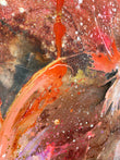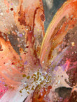 Striking abstract blooms in a range of orange, pink, lilac and gold. So much depth and movement in this original painting. Varnished with archival gloss varnish, this piece is framed in white and is absolutely stunning!